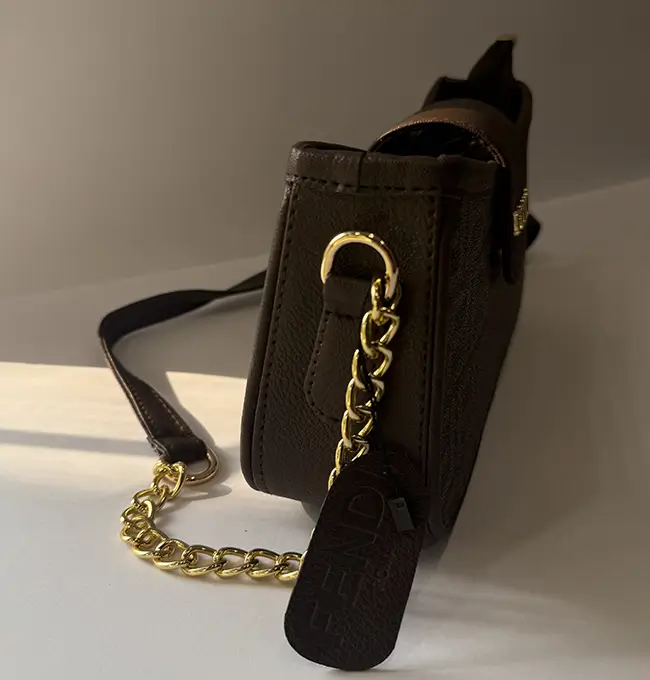 • Hardware: Gold-tone metal accents