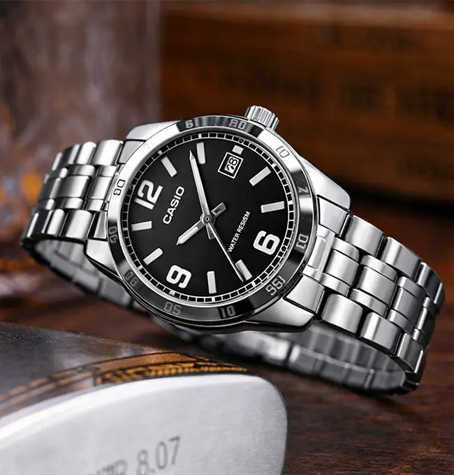 A premium Casio men’s watch with a black analog dial, silver stainless steel chain, water resistance, and 1-year warranty—ideal for everyday elegance.