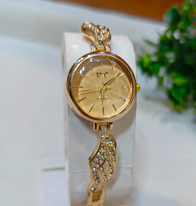 Upgrade your style with this beautiful FT Gold Ladies Watch featuring a luxurious textured dial and a stunning crystal leaf bracelet design. Its elegant gold finish and reliable quartz movement make it the perfect accessory for both daily wear and special occasions.