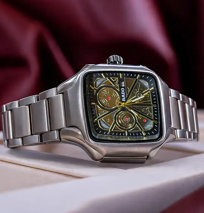 Elegant square-shaped automatic watch by Rado, featuring water resistance, scratch-proof ceramic design, and a 1-year warranty.