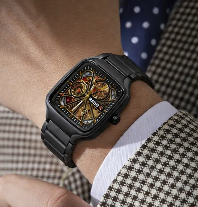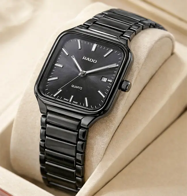 Design & Style: A modern, elegant timepiece featuring a distinctive square-shaped ceramic case. Its minimalist design and polished finish make it perfect for both formal and casual occasions.